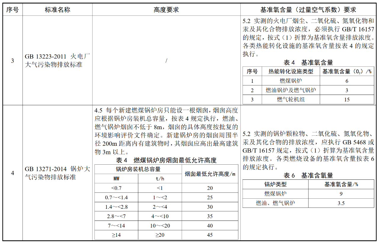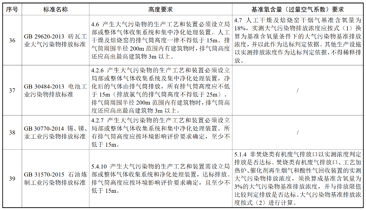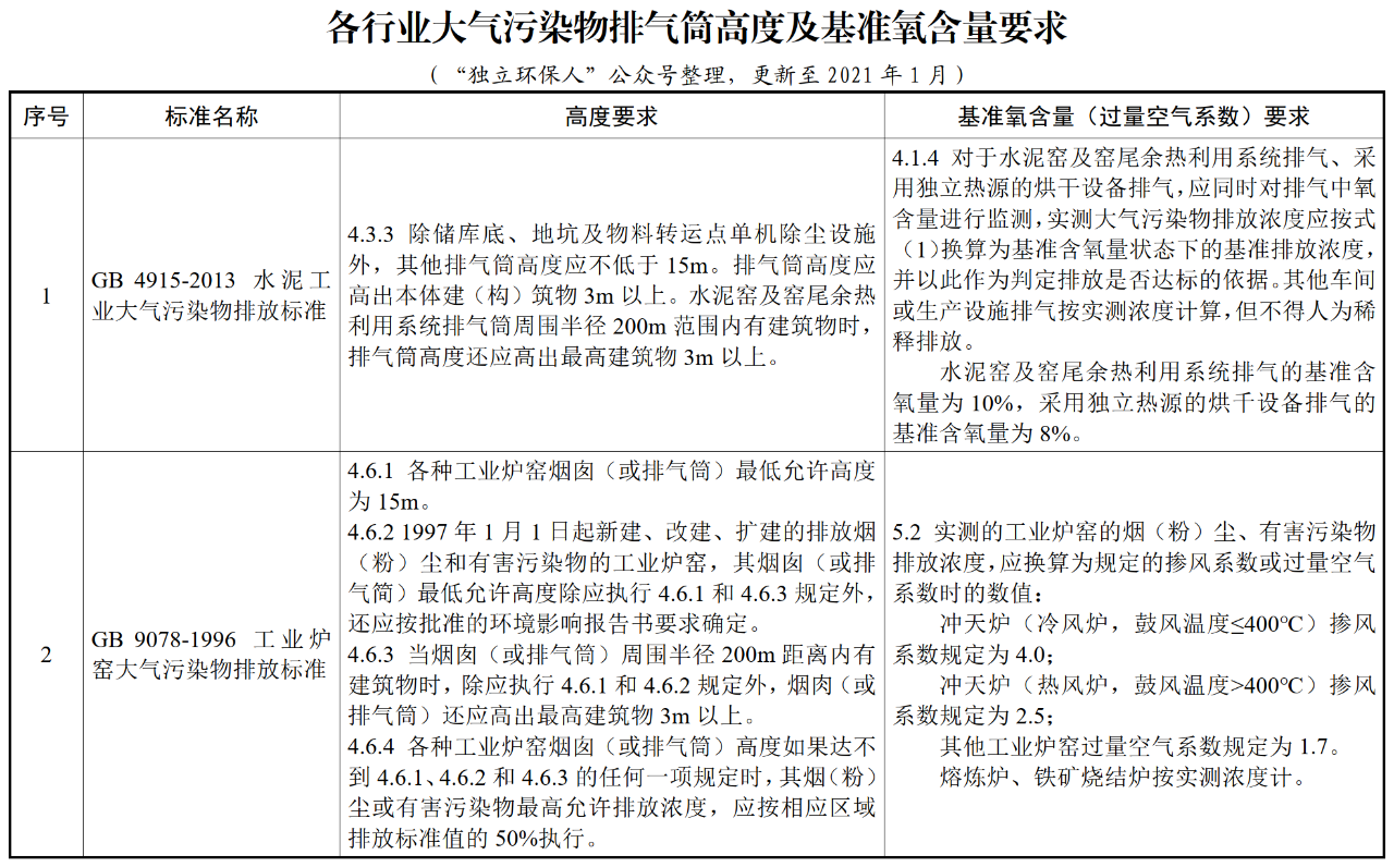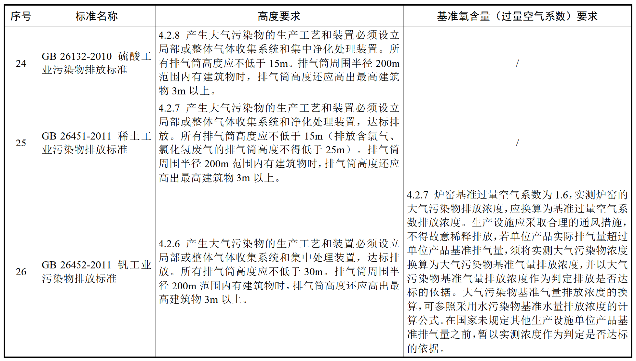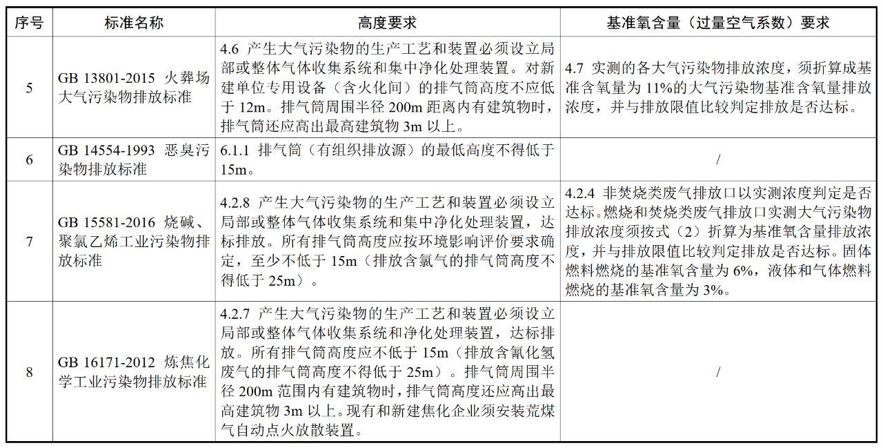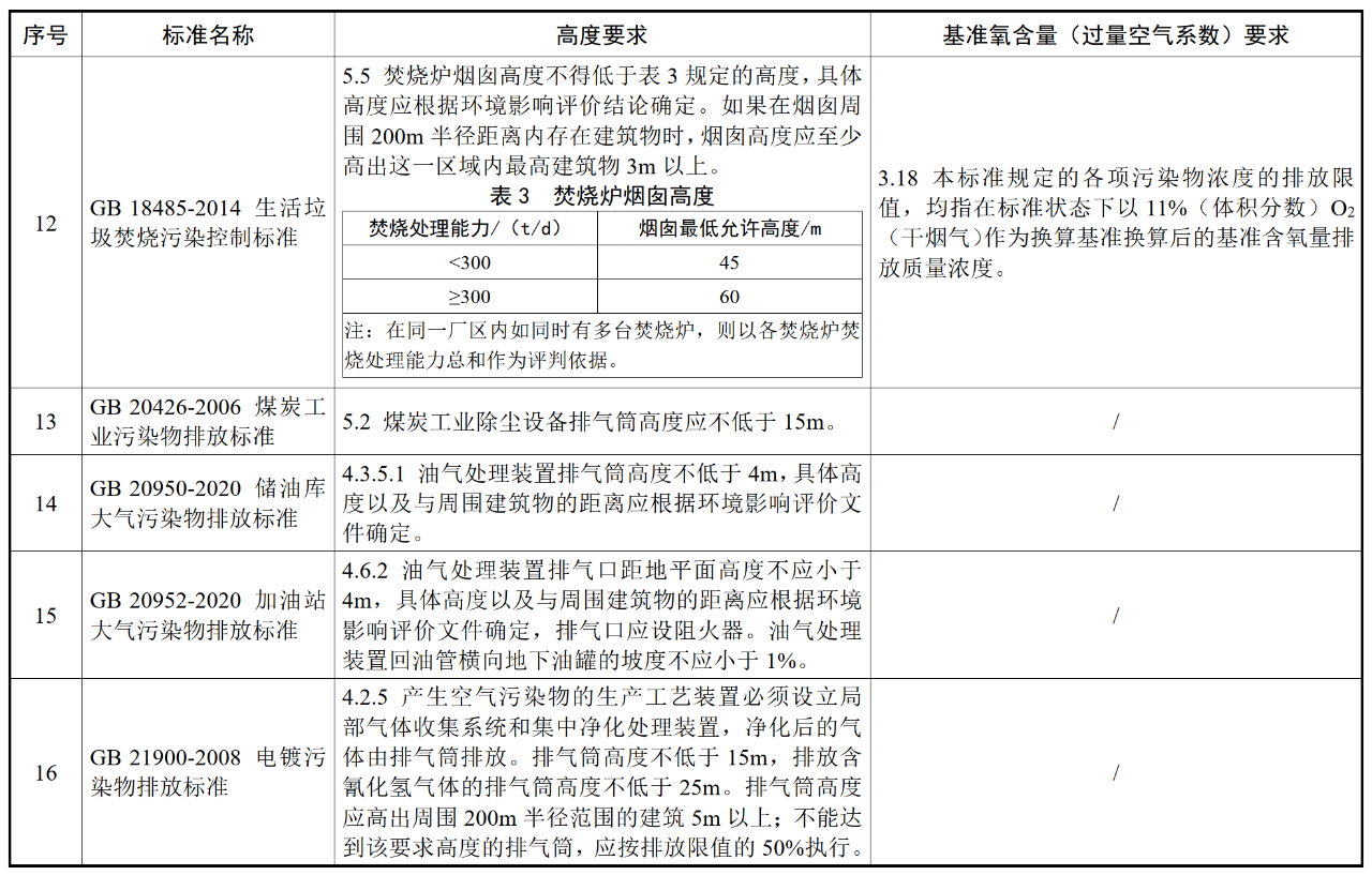 各行業大氣污染物排氣筒高度及基準氧含量要求
