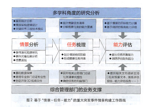 重大突發(fā)事件情景構(gòu)建是理論與實(shí)踐的銜接,該項(xiàng)工作必須由科研部門和實(shí)踐綜合管理部門的密切配合,按照情景任務(wù)能力的邏輯主線依次展開,才能完成情景構(gòu)建研究,具體工作路線如圖2所示。