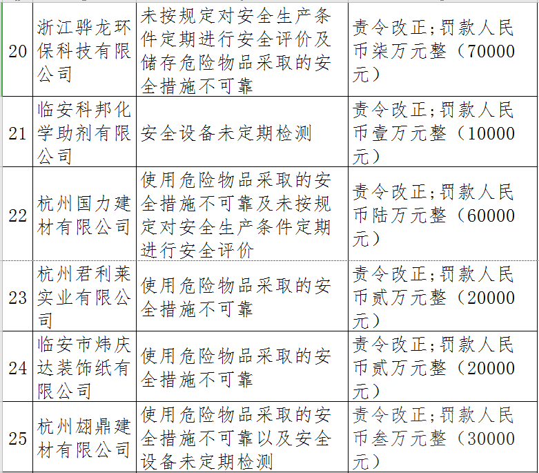 據了解,今年上半年,杭州市應急管理局一手抓駐企復工復產、一手抓安全生產,已完成年度執法計劃、專項檢查、聯合執法、信訪舉報核查等,并對檢查中發現的安全生產違法違規企業(個人)進行了處罰。現對52家被行政處罰的企業(個人)進行曝光,希望各企業引以為戒!