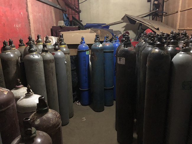 浙江杭州市案例:2021年3月8日上午,浙江省杭州市蕭山區(qū)應(yīng)急管理局執(zhí)法人員對某公司進行執(zhí)法檢查。期間,執(zhí)法人員發(fā)現(xiàn)廠區(qū)內(nèi)一簡易鋼棚搭設(shè)的倉庫,玻璃窗均被物體人為遮擋,檢查發(fā)現(xiàn)倉庫內(nèi)堆放了大量危化品,包括滿瓶二氧化碳、氧氣、乙炔、混合氣體、氮氣等176個氣瓶。同時,該倉庫緊鄰公司員工宿舍樓搭設(shè),宿舍樓里還住著數(shù)十個工人,一旦發(fā)生爆炸,后果不堪設(shè)想。