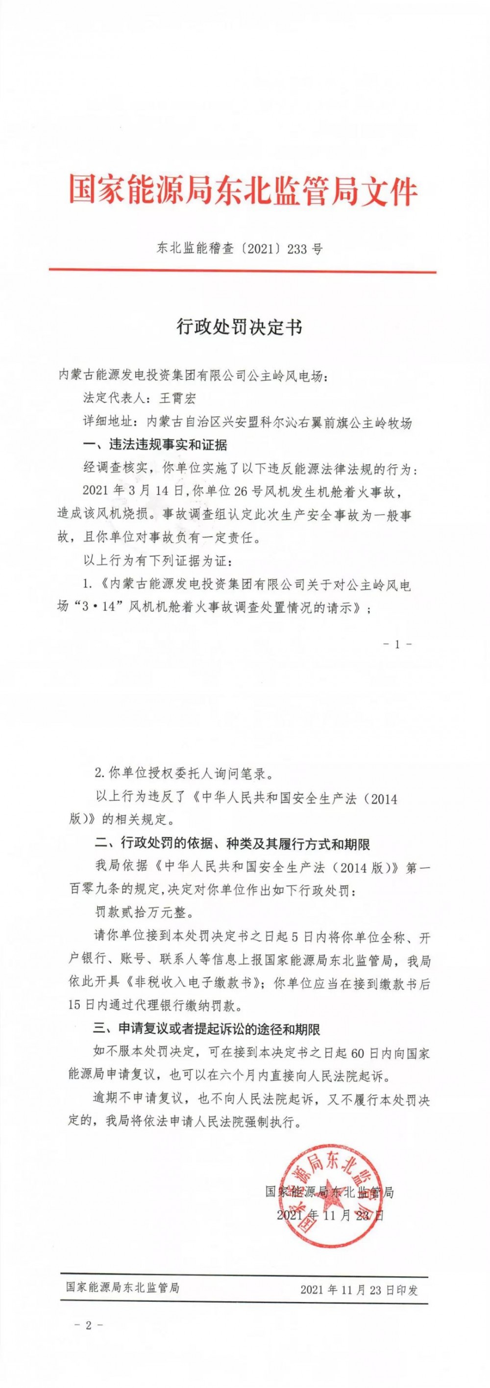 記者獲悉,11月23日,國家能源局東北監(jiān)管局通報關于公主嶺風電場“3·14”風機機艙著火事故行政處罰決定書,依據《中華人民共和國安全生產法(2014版)》第一百零九條的規(guī)定,決定對內蒙古能源發(fā)電投資集團有限公司進行罰款20萬元整。