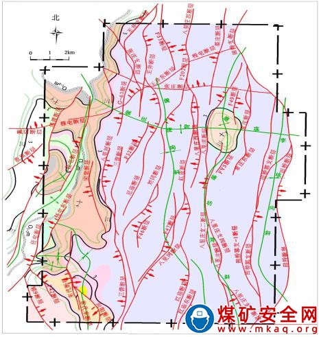 山東龍鄆煤業(yè)有限公司前身為山東省鄆城煤礦,位于菏澤市鄆城縣潘渡鎮(zhèn)境內(nèi),南距鄆城縣城 6 千米。原隸屬于山東省齊魯新航集團(tuán)有限責(zé)任公司,2006 年 9 月開工建設(shè)。2011 年 1 月起,山東省鄆城煤礦由龍礦集團(tuán)托管。2016 年 6 月,龍礦集團(tuán)與山東省齊魯新航集團(tuán)有限責(zé)任公司簽訂了《山東省鄆城煤礦移交接管劃轉(zhuǎn)協(xié)議》,礦井的生產(chǎn)建設(shè)主體變更為龍礦集團(tuán)。2017 年 4 月,礦井正式投產(chǎn),設(shè)計生產(chǎn)能力 240 萬噸/年。2017 年 12 月,礦井更名為山東龍鄆煤業(yè)有限公司(以下簡稱龍鄆煤礦)。2017 年 5~12 月,生產(chǎn)原煤 160 萬噸;2018 年 1~9 月,生產(chǎn)原煤 177.73萬噸。礦井采礦許可證、安全生產(chǎn)許可證、工商營業(yè)執(zhí)照齊全有效。礦井開采條件。井田位于巨野煤田最北端,屬全隱蔽的華北型石炭、二疊系煤田。井田范圍由 20 個拐點(diǎn)坐標(biāo)圈定,面積 198.3 平方公里,開采標(biāo)高-450~-1750 米。井田含煤地層為山西組和太原組,其中主采煤層為山西組 3 煤層。井田處于鄆城斷裂、巨野斷裂、曹縣斷裂和汶泗斷裂的“井”字形中間區(qū)內(nèi),井田的典型構(gòu)造特征為斷塊型。井田總體呈走向近南北、傾向東的單斜構(gòu)造,勘查發(fā)現(xiàn)全井田共有斷層 130 條,其中,一采區(qū) 37 條。見圖 1。