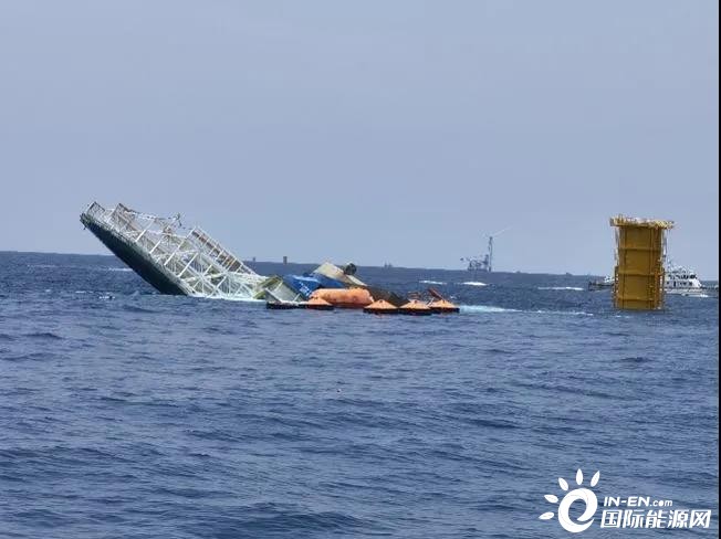 7月26日,中廣核惠州風(fēng)電項目“升平001”號作業(yè)船施工平臺發(fā)生傾斜事故后,搜救行動進入第二天,仍有4人失聯(lián)!據(jù)了解,"升平001"施工平臺露出水面部分在緩慢減小,有趨向沉沒的跡象,平臺上面的鐵架已倒入水下。