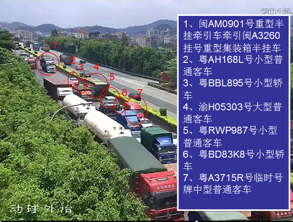 此次事故造成粵BBL895號小型轎車駕駛員江文洪及其車上乘客劉偉杰、江文靜、黃意娣四人當場死亡,七車不同程度損壞,事故直接經(jīng)濟損失約413.5萬元。