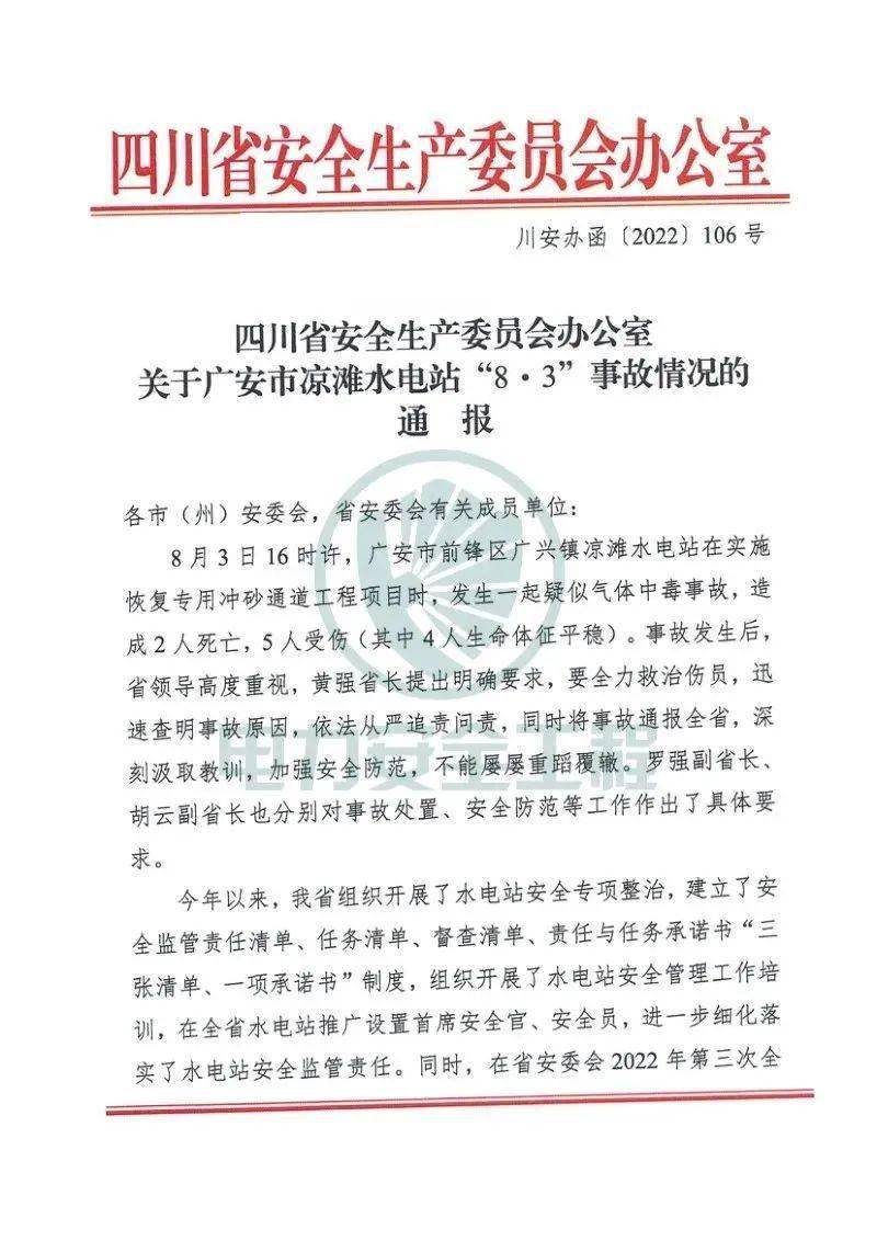 2022年8月3日,四川省廣安市前鋒區廣興鎮涼灘水電站在實施恢復專用沖砂通道工程項目過程中,發生中毒事故,造成3人死亡,4人受傷。