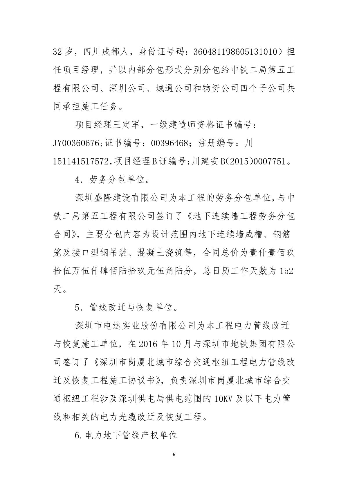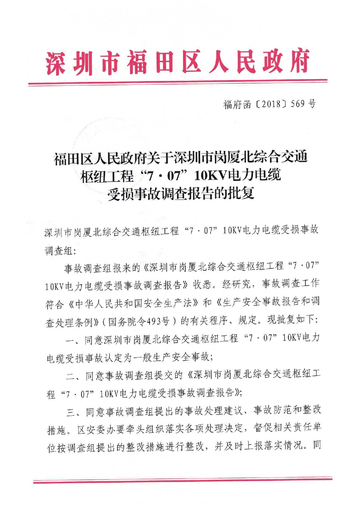 福田區(qū)人民政府關(guān)于深圳市城市軌道交通6號線二期主體工程6111標(biāo)“7.05”10kv電力電纜受損事故調(diào)查報告