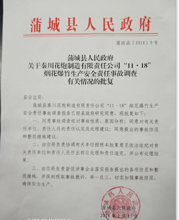 蒲城縣秦川花炮制造有限責(zé)任公司“11?18”煙花爆竹一般生產(chǎn)安全責(zé)任事故調(diào)查