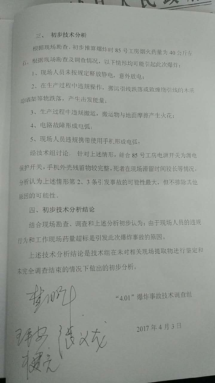 2017年4月1日晚上20時40分左右,蒲城縣光華花炮引線有限公司發(fā)生一起燃燒爆炸傷亡生產(chǎn)安全事故。4月1日晚20時40分左右,蒲城縣光華花炮引線有限公司生產(chǎn)廠區(qū)西南角85號繞引工房發(fā)生爆炸,劇烈爆炸引起85號繞引工房內(nèi)存放的成品引線及其他物件燃燒并拋射出去,繼而引發(fā)79號、89號兩個繞引工房也發(fā)生了燃燒爆炸。事故發(fā)生后,該公司值班領(lǐng)導(dǎo)向公司領(lǐng)導(dǎo)進行了報告,該公司立即啟動了《生產(chǎn)安全事故應(yīng)急救援預(yù)案》,進行現(xiàn)場救援,組織少量工人趕到爆炸現(xiàn)場周邊進行搜尋、救援,組織廠區(qū)其他工人撤出生產(chǎn)廠區(qū),同時向110、119、120請求救援,向相關(guān)政府部門進行了報告。接到報告后,縣政府主管安全陳健副縣長、值班領(lǐng)導(dǎo)菊峰副縣長立即趕赴事發(fā)地現(xiàn)場指揮,縣公安局、安監(jiān)局、興鎮(zhèn)政府、花炮執(zhí)法大隊、花炮打非大隊、消防大隊、120急救部門第一時間趕到現(xiàn)場進行救援處置,晚上21時20分左右成功撲滅事故現(xiàn)場明火。該公司組織清點工人人數(shù)時未找到繞引工人李亞妮,在隨后展開的搜尋工作中在爆炸事故現(xiàn)場不遠處發(fā)現(xiàn)李亞妮的尸體,證實該名工人在爆炸中當場死亡。