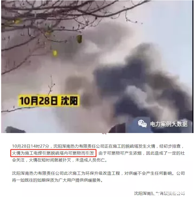 10月28日14時27分,沈陽渾南熱力有限責任公司正在施工的脫硫塔發(fā)生火情,經初步排查,火情為施工電焊引燃脫硫塔內可燃物而引發(fā),由于可燃物可產生濃煙,因此造成了一定的社會關注,火情在短時間就被撲滅,未造成人員傷亡。